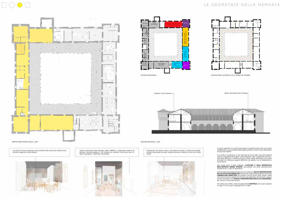 Il castello come luogo di eccellenza di memoria e nel contempo una vetrina del territorio oggi quindi con le implicazioni commerciali certamente ma anche naturalistiche e di svago. La nostra idea è infatti in parte legata alla proposta di una valorizzazione del castello come luogo d’eccellenza del territorio,sia per la valenza storica dell’edificio (uno dei castelli degli Sforza meglio conservati esistente),sia perché rappresenta l’emergenza di un territorio agricolo e naturalistico che può avere sede di riferimento e di conoscenza nel castello.La proposta di ricreare all’interno delle mura una luogo ove sia possibile ritrovare sia i prodotto della terra,venduti con il sistema del kilometro zero,magari alcuni giorni della settimana o collegati ai giorni di mercato,sia i prodotti dell’uomo e quindi un museo del territorio che sia sede delle associazioni per la valorizzazione e studio, sia delle strade dei fontanili,che possono trovare nel book shop documentazione e tracciati o ricevere la scheda per l’uso di bici comunali da utilizzare per conoscere il territorio o girovagare nel centro storico. Ma l’aspetto museale è integrato alle offerte culturali già presenti quali la biblioteca comunale,e a quelle che prevediamo possano essere installate.Si propone di realizzare al piano terreno una emeroteca e un internet-cafè,proprio per integrare e completare l’uso della biblioteca e rendere socializzante l’andare a studiare o a leggere al castello.Ma il luogo di eccellenza deve consentire anche di accogliere turisti o studiosi o cittadini per la quotidianità ed ecco che abbiamo pensato a riutilizzare la zona delle cucine e della mensa per trasformarle in un ristorante ,magari anch’esso legato alle eccellenze del territorio,che svolga anche la funzione di vendita continua e di attrazione.La presenza al piano superiore inoltre delle zona politica amministrativa del comune,con la sala civica e gli uffici del sindaco e del segretario possono essere anch’essi motivo di valorizzazione.